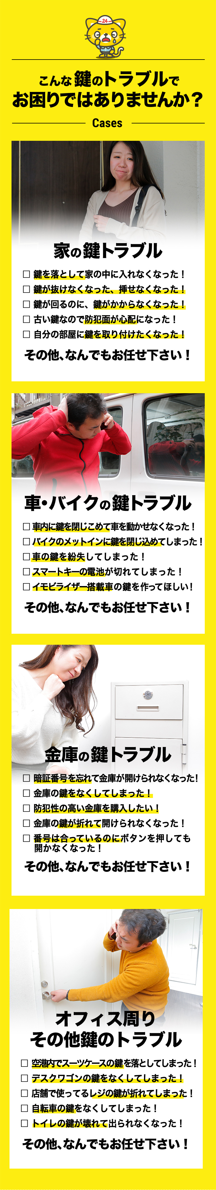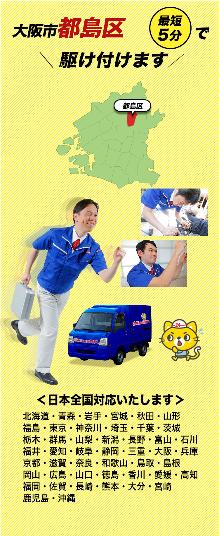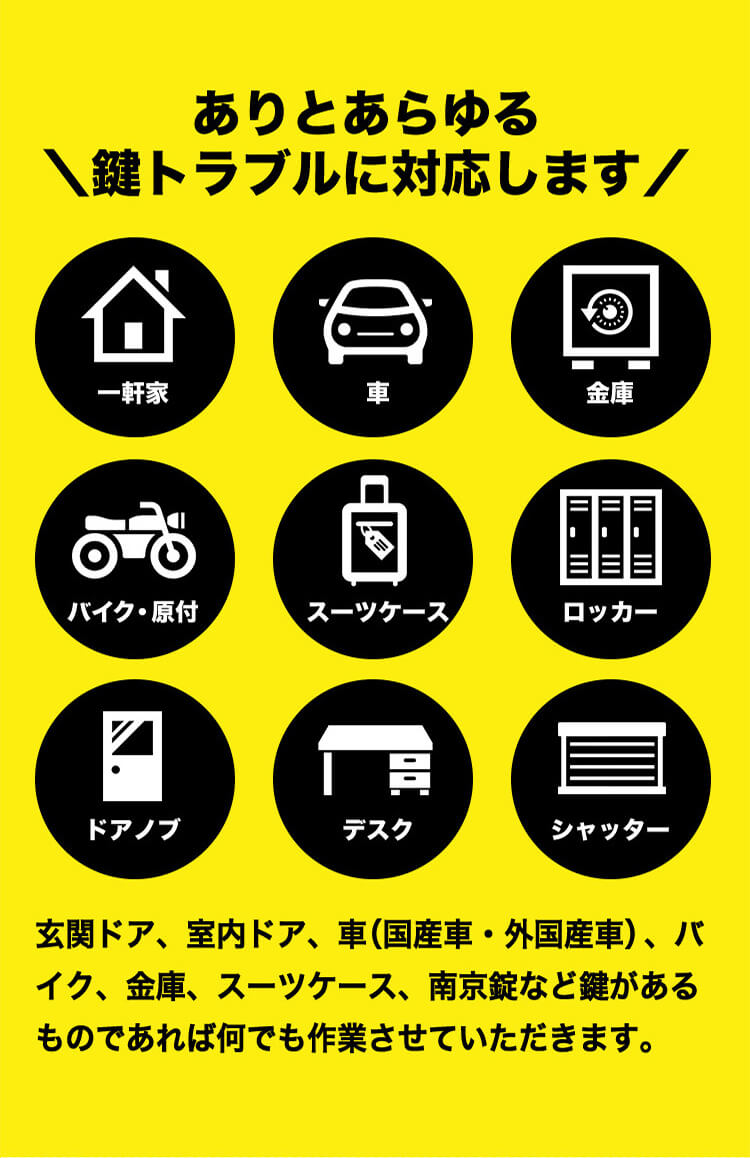 都島区の「カギの24時間救急車」は、スタッフが地元の演劇グループに参加していることから、プレゼンスと状況判断力が養われ、鍵開け、鍵交換、鍵修理の際にもその力を発揮します。都島区で迅速かつ効果的な鍵の対応をお求めの方は、当店がお手伝いします。